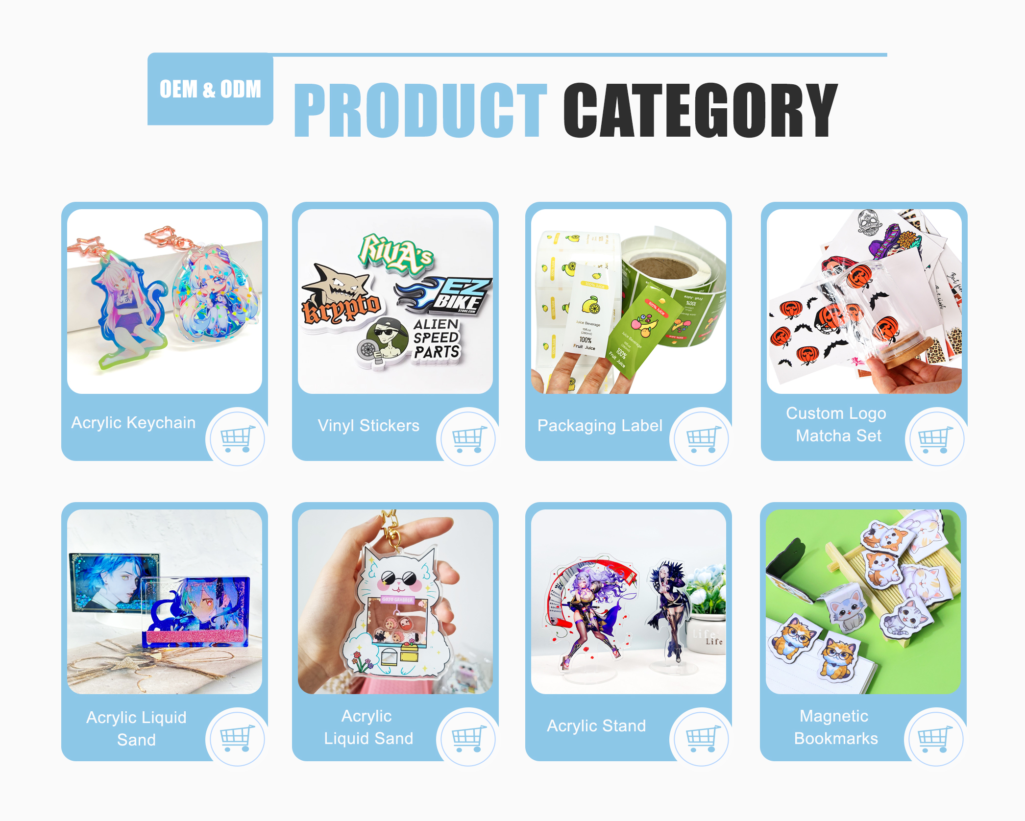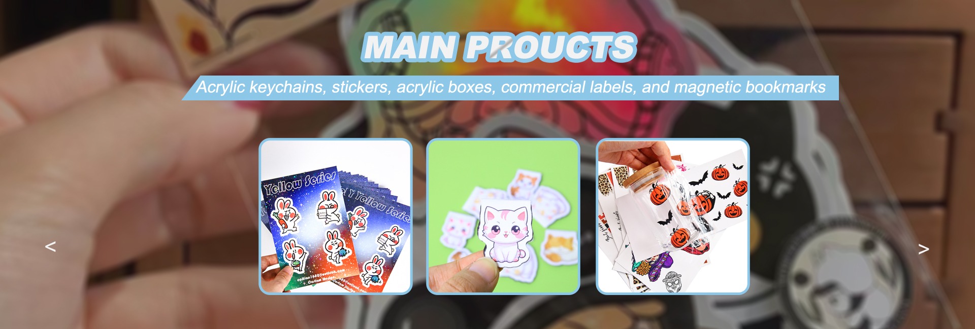 Productos principales:Llavero acrílico, pegatinas, caja acrílica, etiqueta comercial, marcapáginas magnético